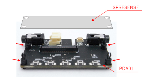 「SPRESENSE」と「PDA01」 のミニスペーサー使用事例 です。矢印4ヵ所が、ミニスペーサー取付位置です。